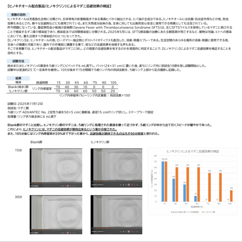 ヒノキチオール配合製品【ヒノキクリン】によるマダニ忌避効果の検証