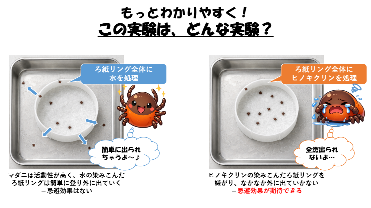 ヒノキチオール配合製品がマダニに対し、どの程度の忌避効果を有するのかを視覚的に判定することで、【ヒノキクリン】によるマダニ忌避効果を検証した。